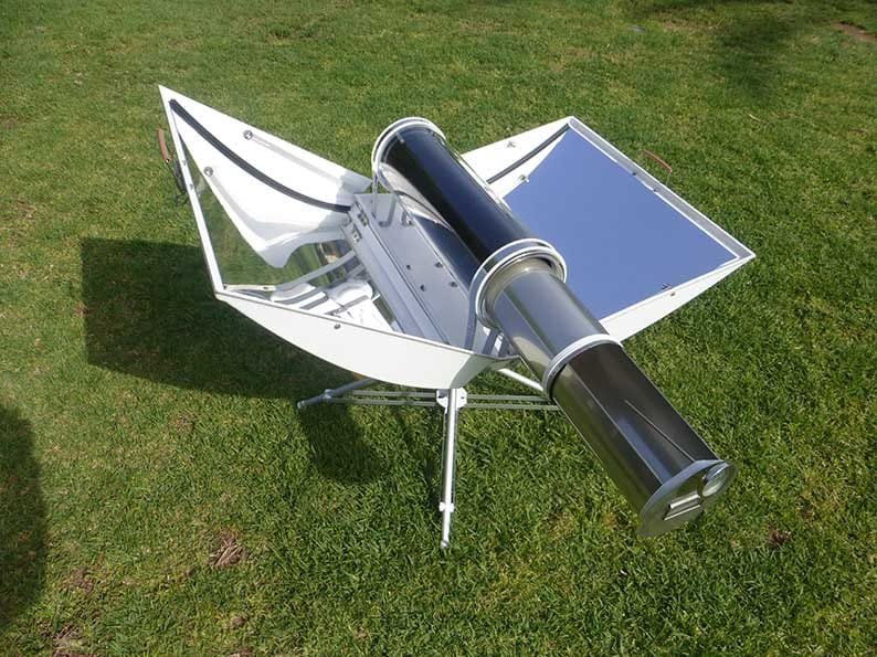Today the Fornelia Mini has an attractive design and is light, portable and easy to use. There are future plans for a larger, stationary model, a model with heat storage for cooking after the sun goes down, and a model with a collector of solar energy outside and an oven/stove inside the house, like any ordinary oven/stove.